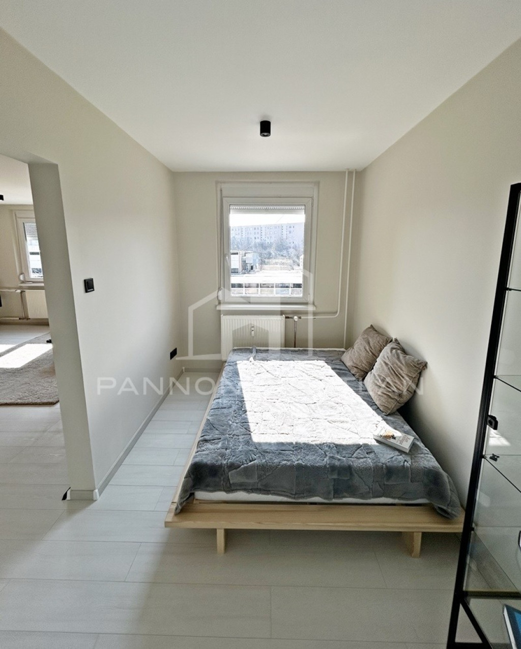 A külön nyíló hálószoba biztosítja az intim életteret, ahol egy nagy méretű, beépített gardróbszekrény található, amely bőséges tárolási lehetőséget kínál.