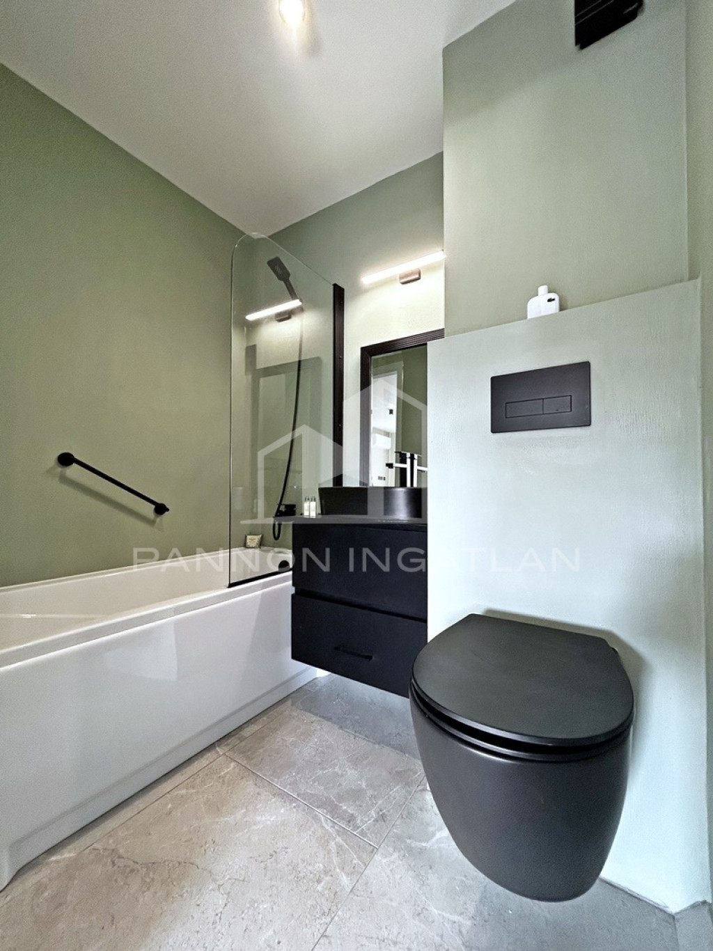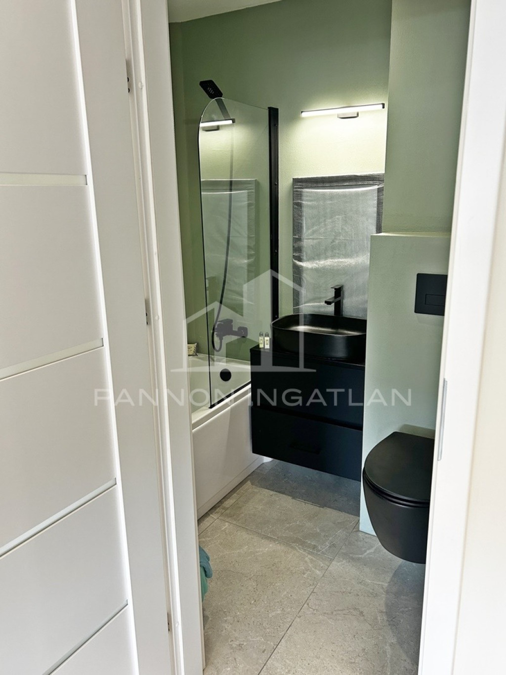 A fürdőszoba modern kialakítású, minden berendezés új és első használóra vár.