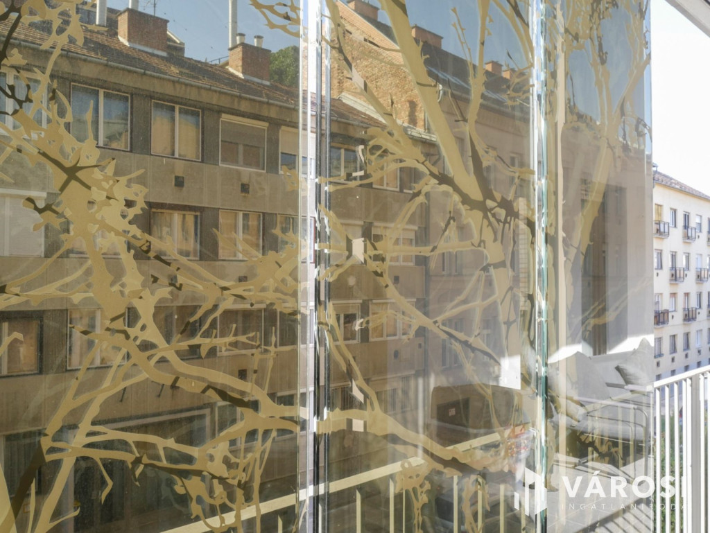 A második emeletei három szobás lakás bútorozott, ideális három-négy fős család számára is. Teljes körűen gépiesített, megtalálható benne hűtőszekrény, mosogatógép, mosógép és klíma. A fürdőszobába kád van beépítve, illetve van egy külön vendégmosdó is. A fűtésről hőszivattyús rendszer gondoskodik, a közlekedőkben padlófűtés van, a szobákban pedig fal- és mennyezetfűtés. Az amerikai konyhás nappali modern, tágas és világos. A terasz déli tájolású, így szépen odasüt a nap, melynek erősségét különleges faág mintás üvegárnyékolókkal tudjuk szabályozni, amik az utca egyik legelegánsabb épületévé teszik az ingatlant.