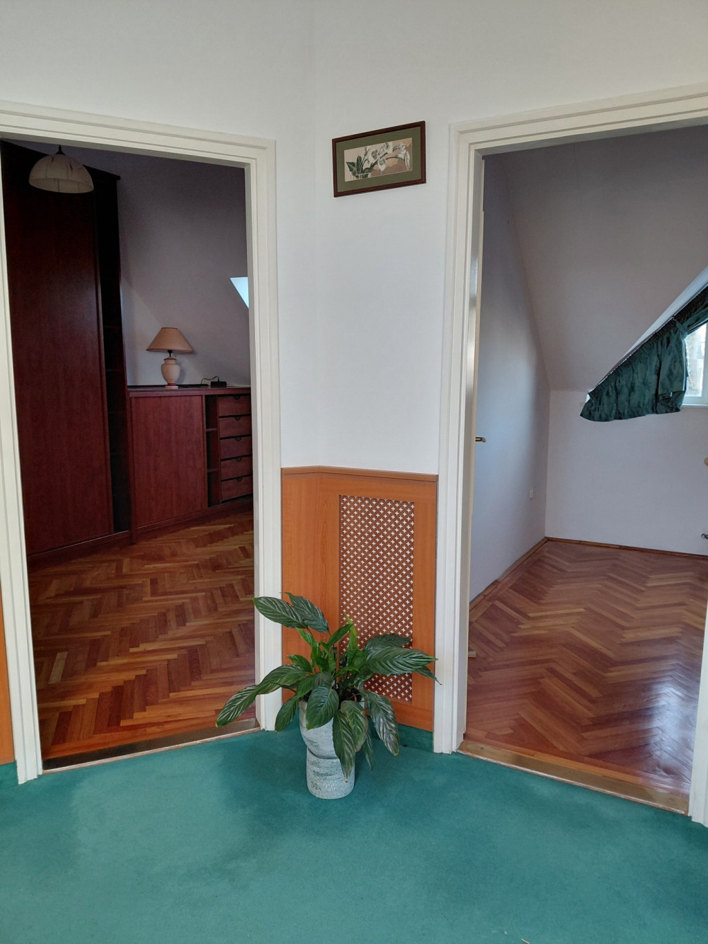 Felső szinten 1 nagy tároló, 1 nagy fürdő, 3 hálószoba és 1 erkély található.