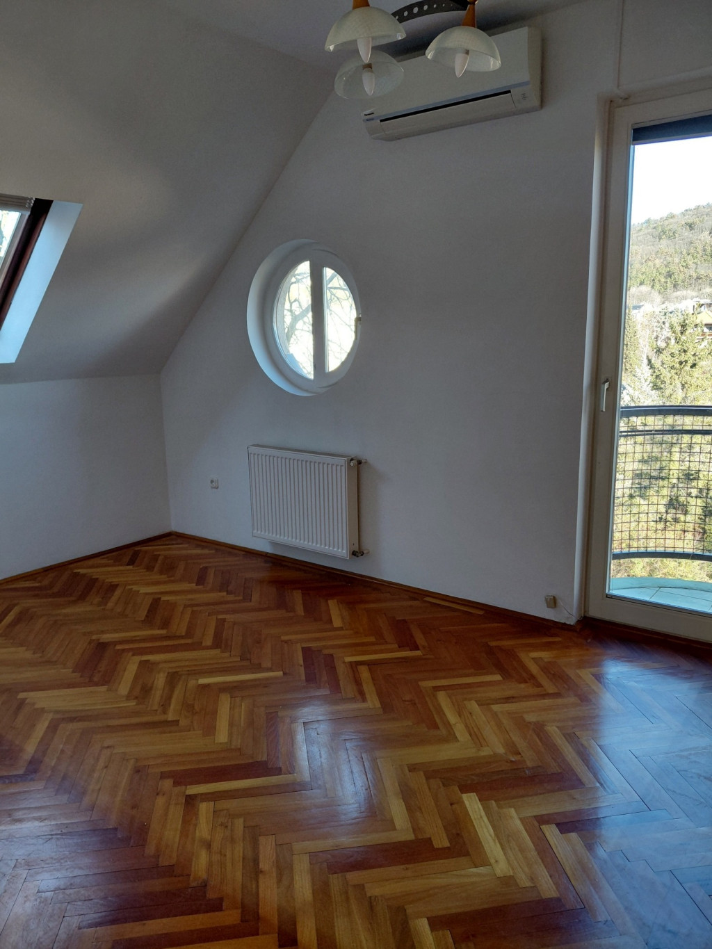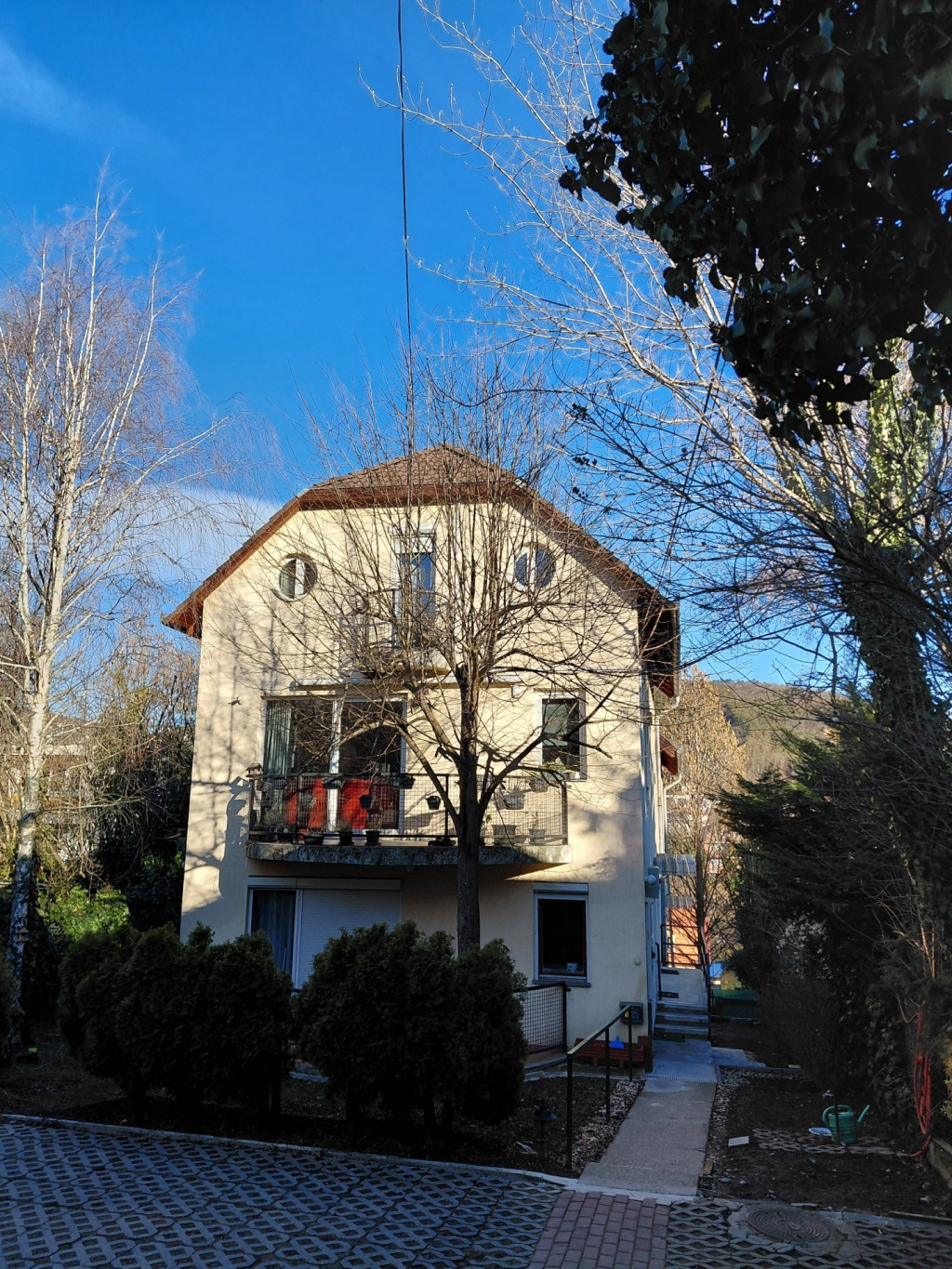 Alsó szinten nappali, külön konyha, 1 hálószoba, 1 kis WC, 1 nagy és 2 kis erkély.