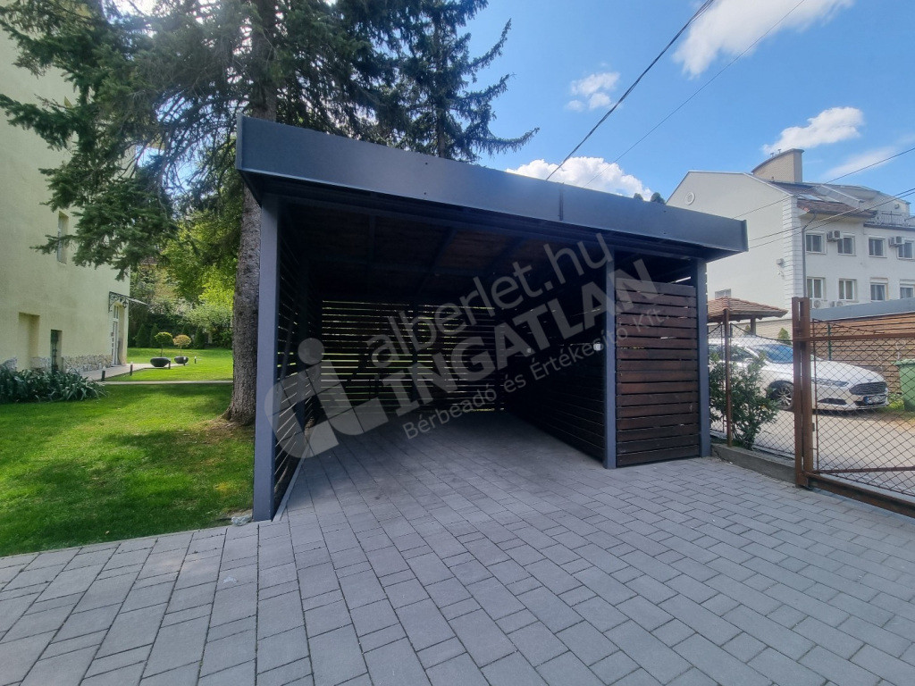 A lakáshoz tartozik egy fedett és egy nyitott udvari parkolóhely, amely a bérleti díj részét képezi. Elektromos autó töltéséhez csatlakozó került kiépítésre.
