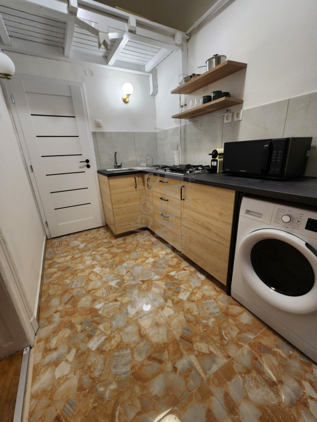 A lakásban mikrohullámú sütő, elektromos kávéfőző, kanapéágy, szekrény, étkezőasztal és mosó-szárítógép található.