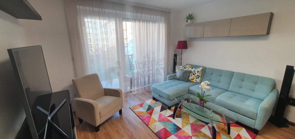 Sunny, nicely furnished, spacious balcony, two bedroom + living room apartment for rent in a modern building.