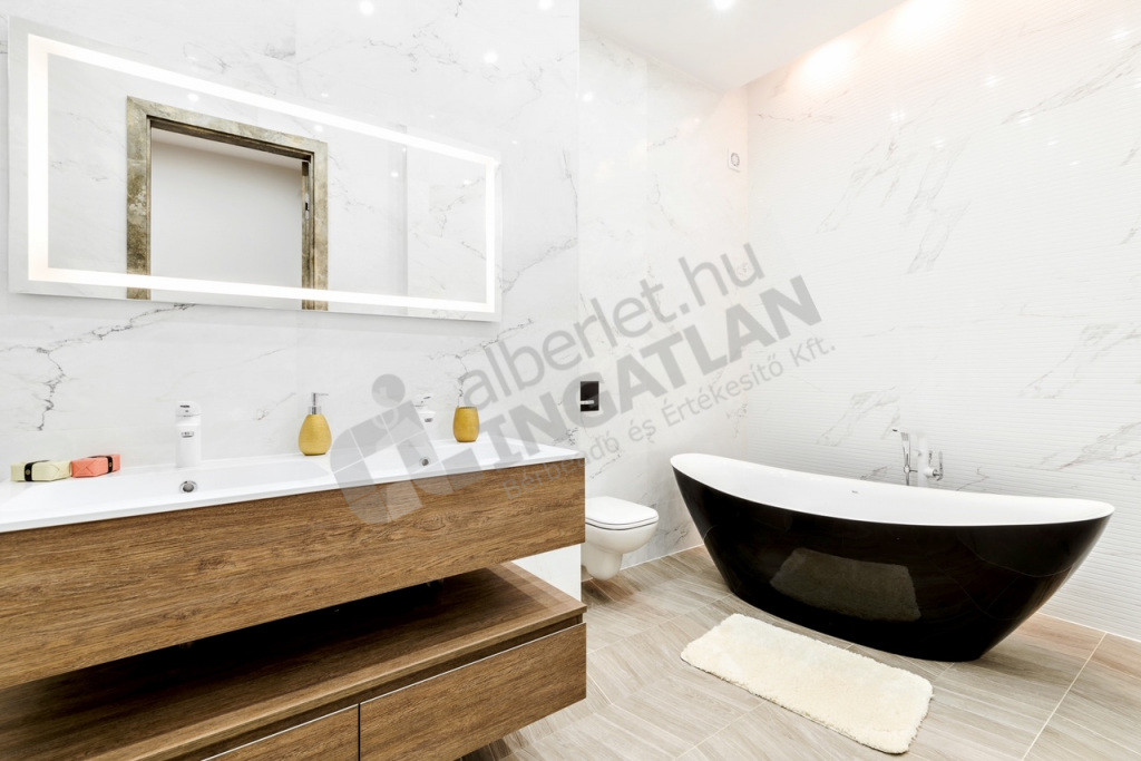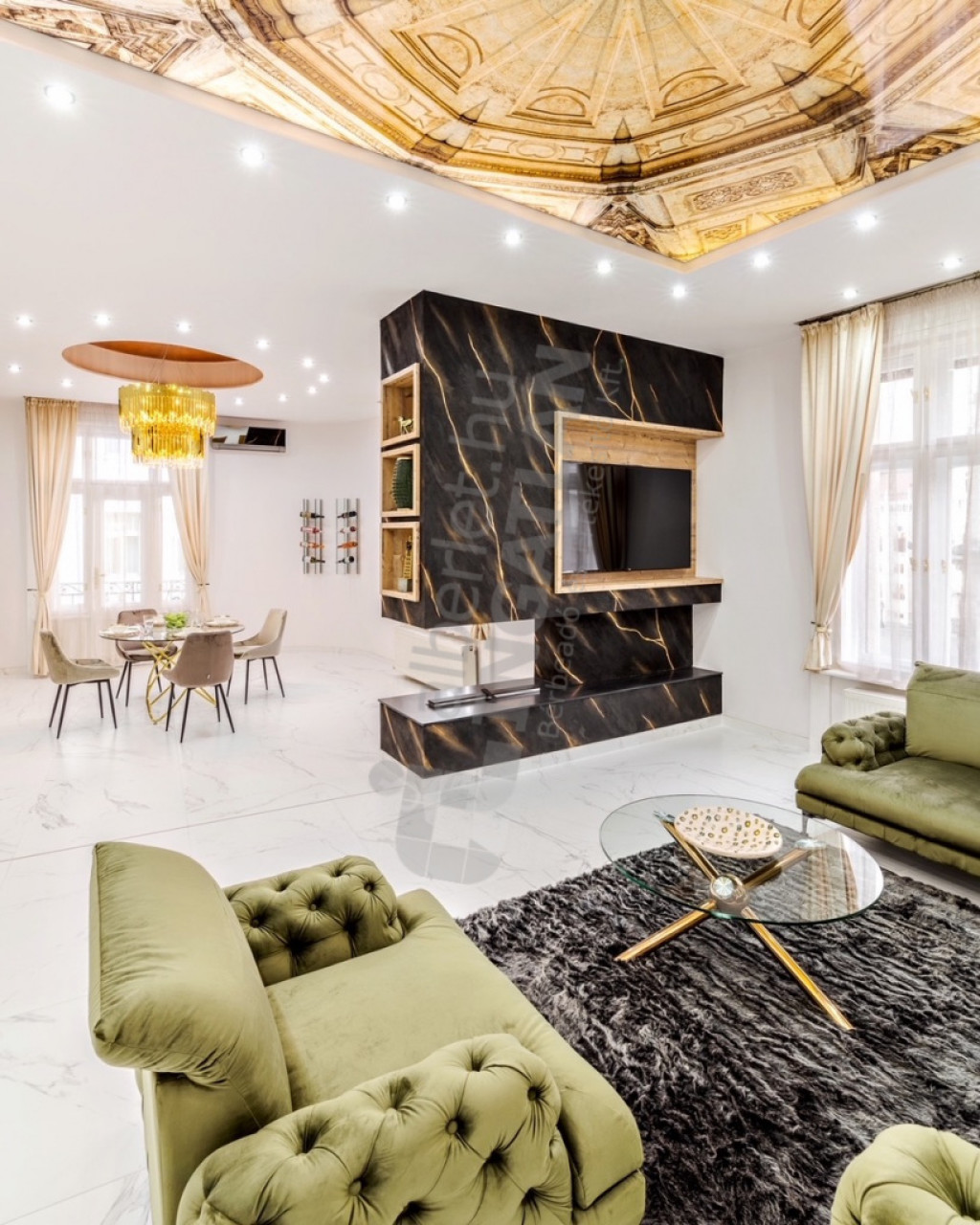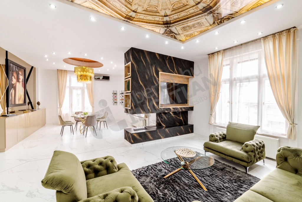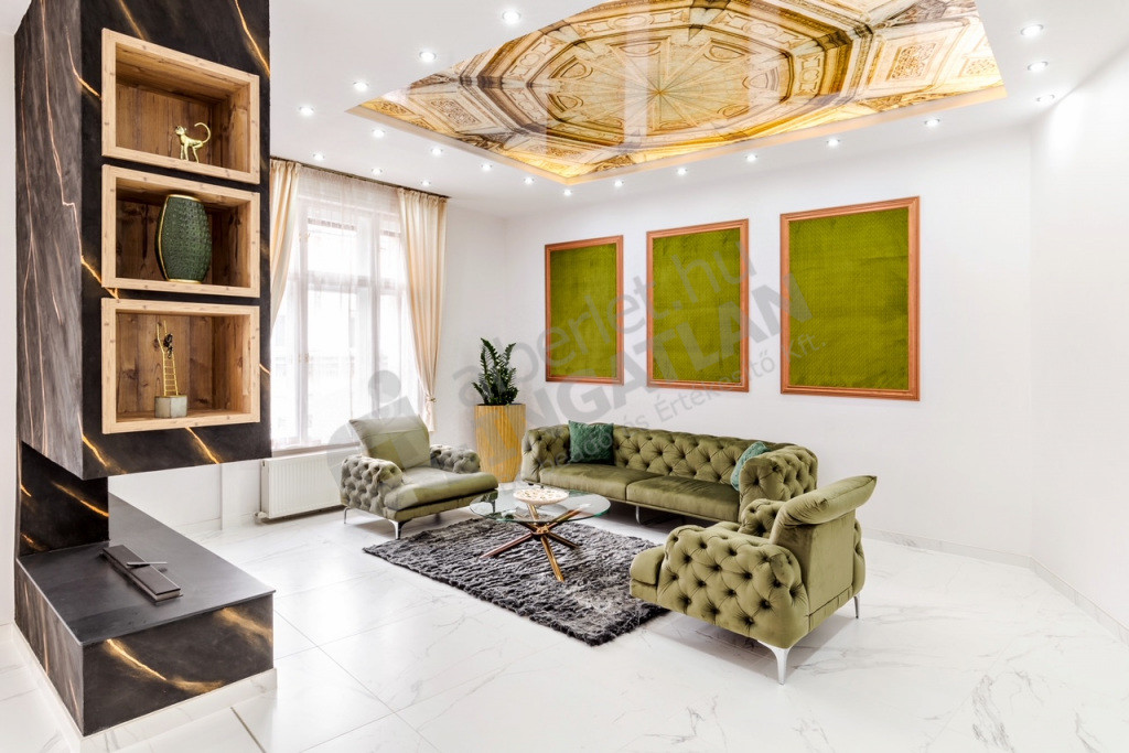 Prémium csempék, fóliamennyezetek, kandalló is található, exkluzív anyagokkal felújított és berendezett ingatlan.