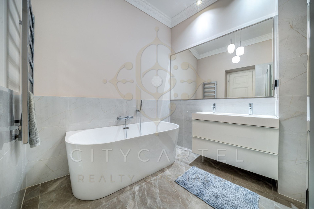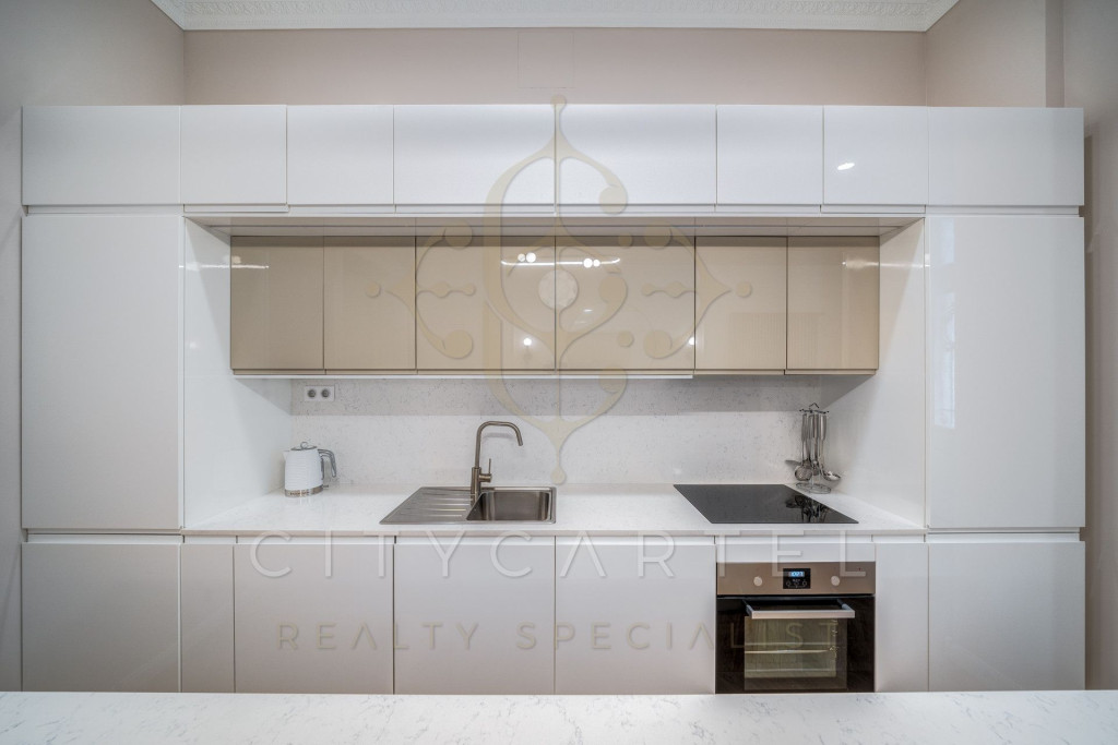 A lakás teljesen bútorozott és gépesített, a bútorok újak, modern stílusúak, és külön megállapodás részét képezik. Az enteriőr egyszerre elegáns és élhető, azonnal költözhető állapotban van.