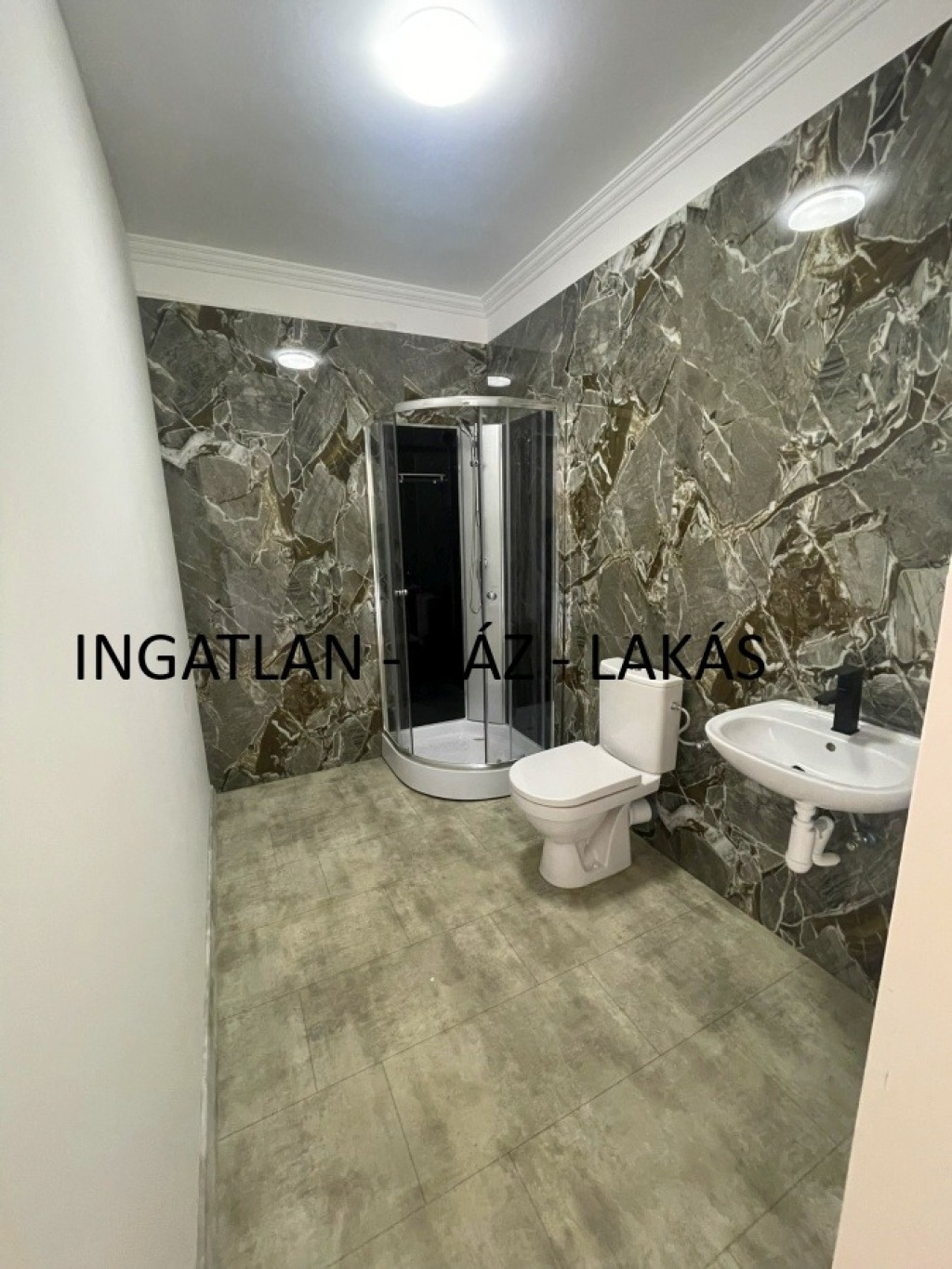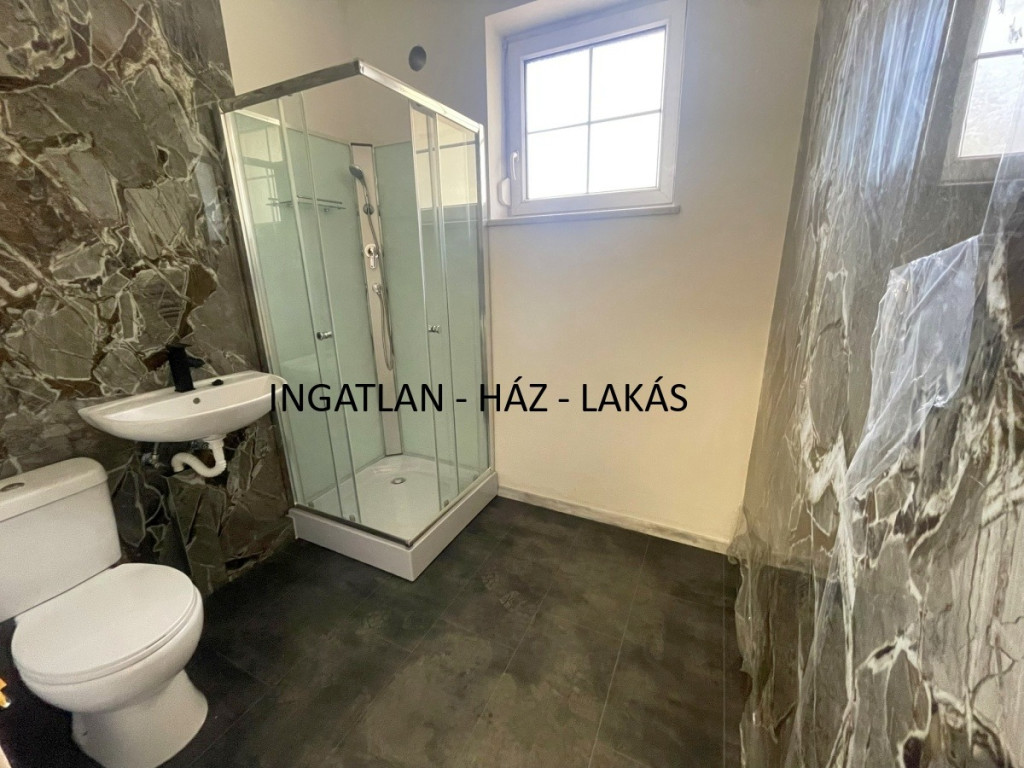 Kialakítva a fürdőszoba mosdó, zuhanyzó és WC a képek alapján. A nappali és hálószoba laminált parketta burkolatú itt található egy légtérben a konyha melyben főzőlap és mosogató, illetve konyhaszekrény található.