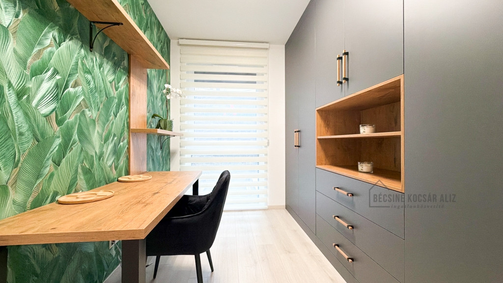 A hálószobához kapcsolódó külön gardrób vagy dolgozószoba praktikus lehetőséget kínál otthoni munkavégzéshez is. A hangulatos, privát terasz kellemes kiegészítője a lakótérnek.
