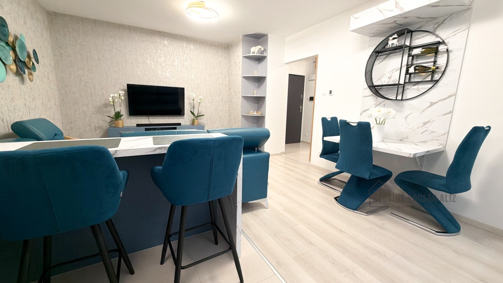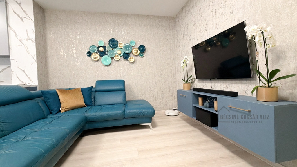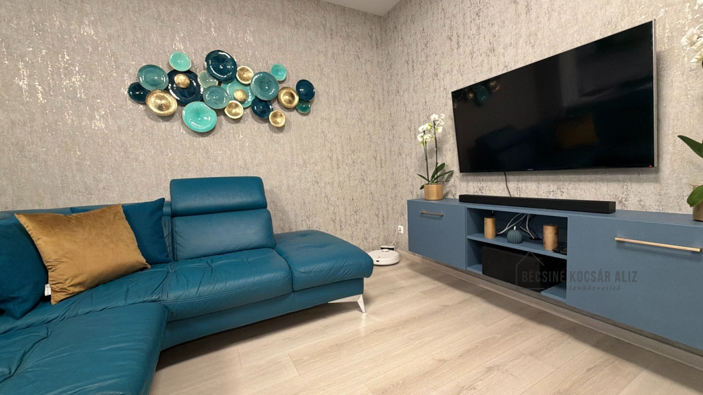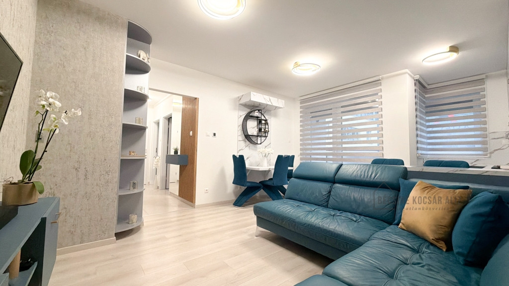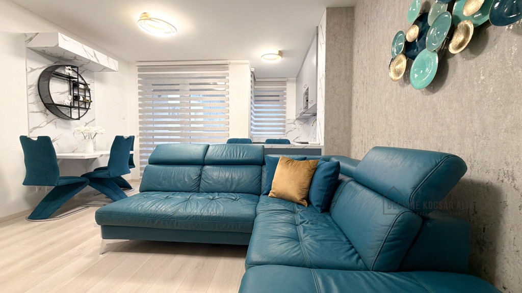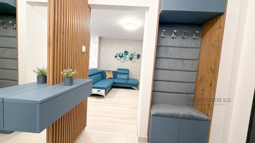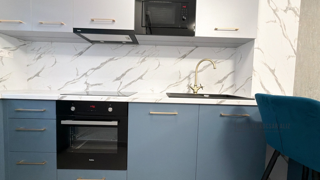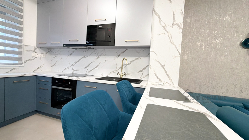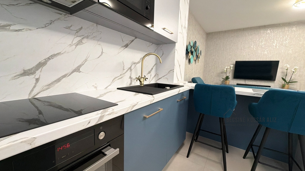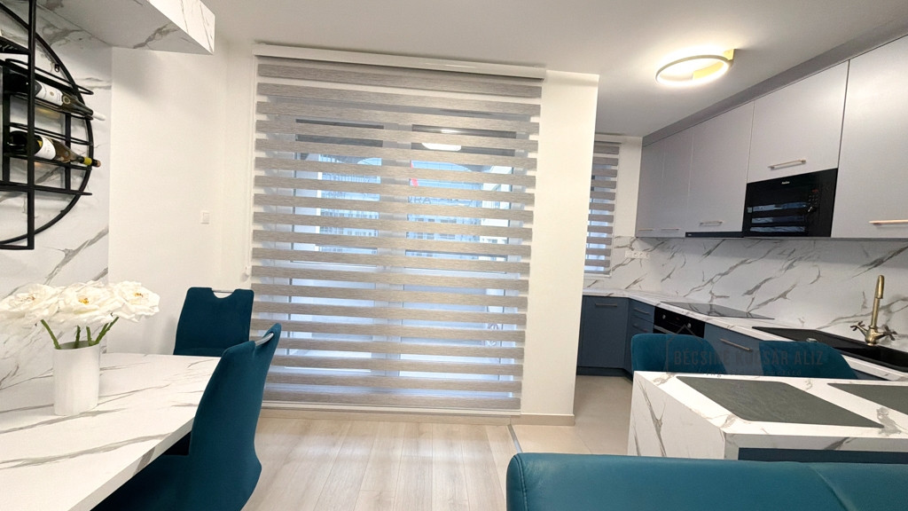 Az amerikai konyhás nappali modern, bárpultos kialakítású, amely elegánsan tagolja a teret. A teljes berendezés egységes design koncepció mentén készült, prémium minőségű bútorokkal és gondosan összehangolt részletekkel. A nappaliban és a hálószobában okos TV biztosítja a kényelmet, a konyha igény szerint további felszereltséggel bővíthető. A fürdőszobában walk-in zuhany esőztető fejjel és minőségi burkolatokkal került kialakításra, AEG mosógéppel felszerelve.