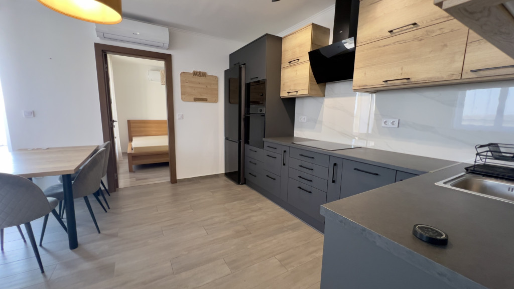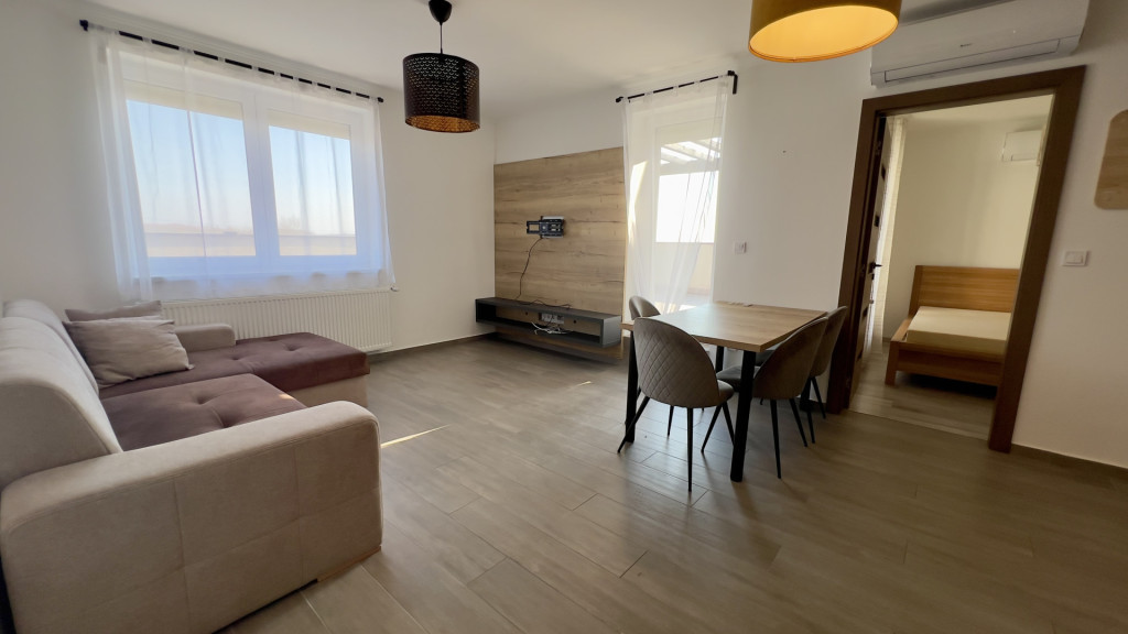 Elrendezése: előszoba, am.-konyha-étkező-nappali, 2 hálószoba, fürdőszoba, wc, 60nm terasz.