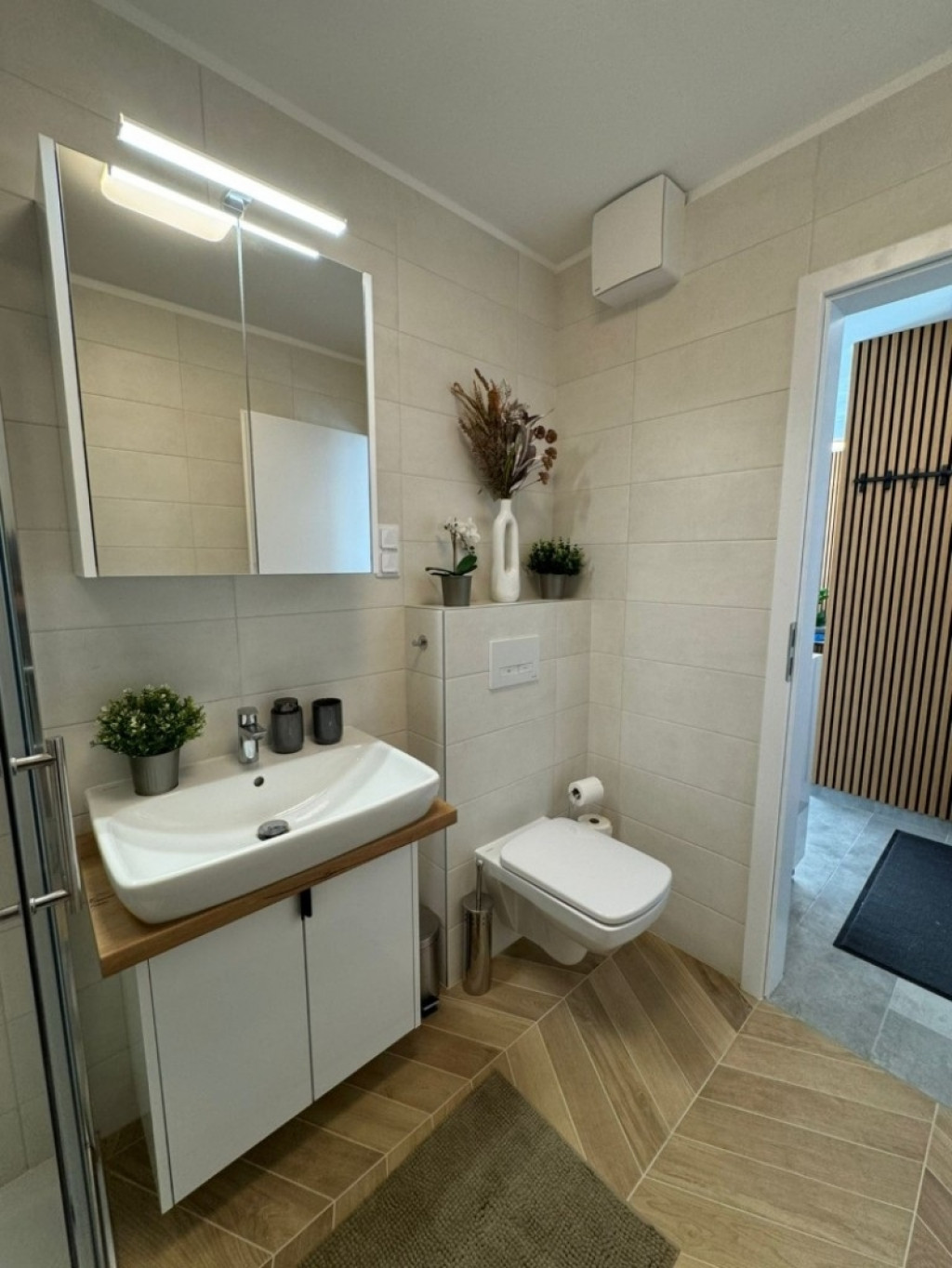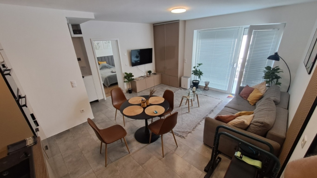 A konyhában beépített mosogatógép, hűtő és sütő is rendelkezésre áll, a nappaliban okos TV is található.