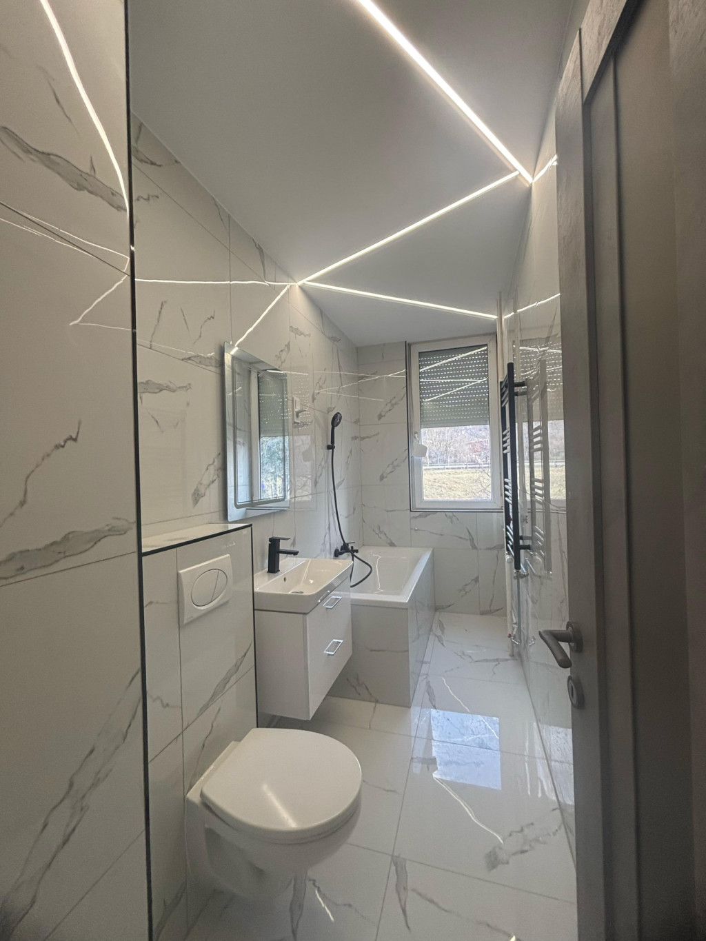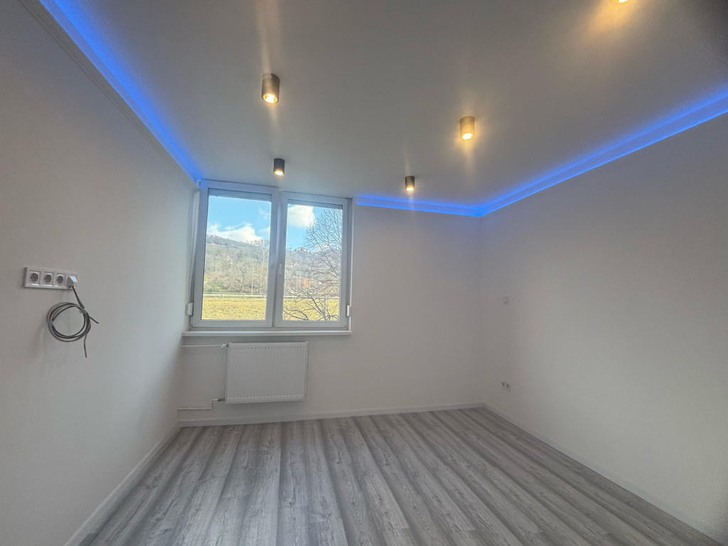 A Központi Ingatlanközvetítő Iroda ajánlja kiadásra, Tatabányán, Újvárosban, ezt a zöldövezeti, napfényes, egyedileg átalakított, 55 nm-es, erkélyes, ingatlant hosszú távra.A lakás egy négyemeletes társasház 2. emeletén található, teljeskörűen, igényesen felújított, modern, jó elrendezésű. Helyet kapott benne 2 szoba, amerikaikonyhás nappali, közlekedő, fürdőszoba WC-vel, erkély. A szobák laminált padlóval, a többi helyiség járólappal burkolt.